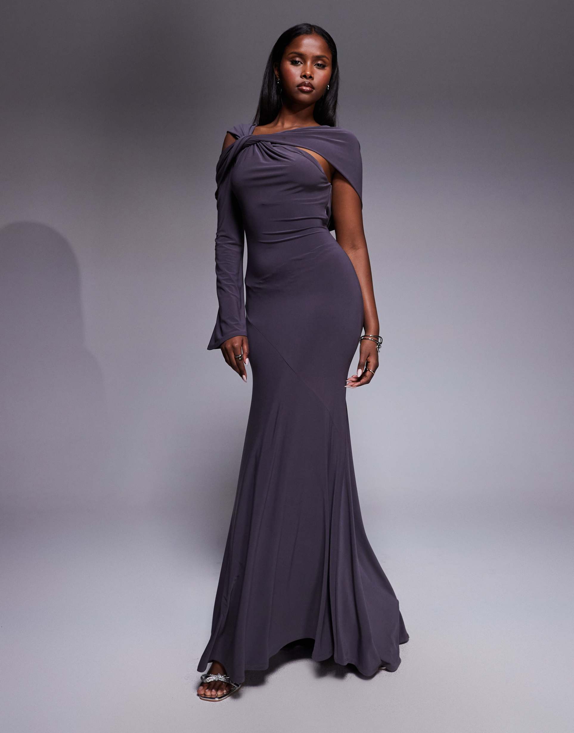 ASOS DESIGN TWIST DETAIL ONE SLEEVE MAXI DRESS IN SLATE GRAY