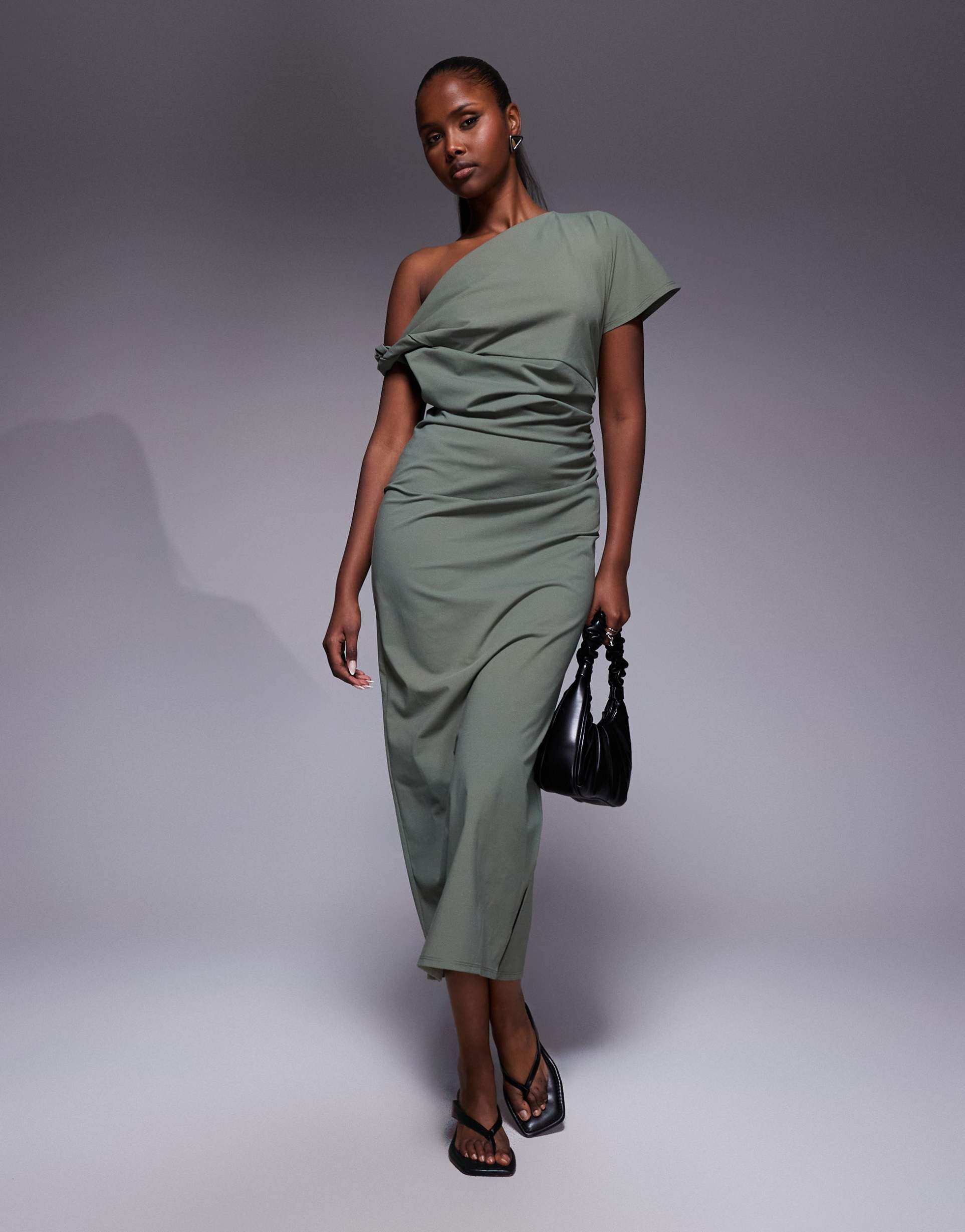 ASOS DESIGN TWIST SHOULDER DETAIL MIDI DRESS IN KHAKI