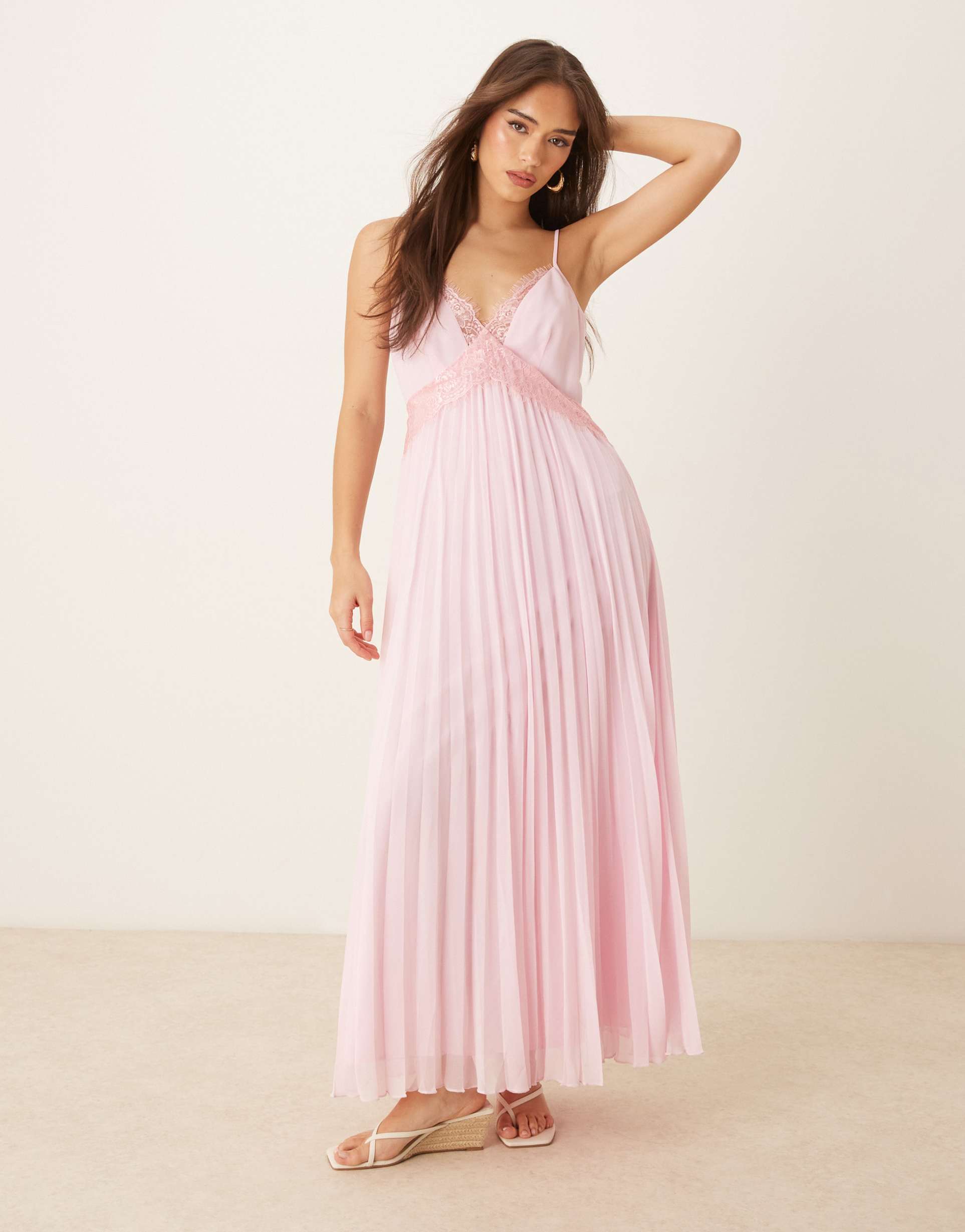 ASOS DESIGN V NECK LACE TRIM PLEATED CAMI MIDI DRESS IN SUGARY PINK