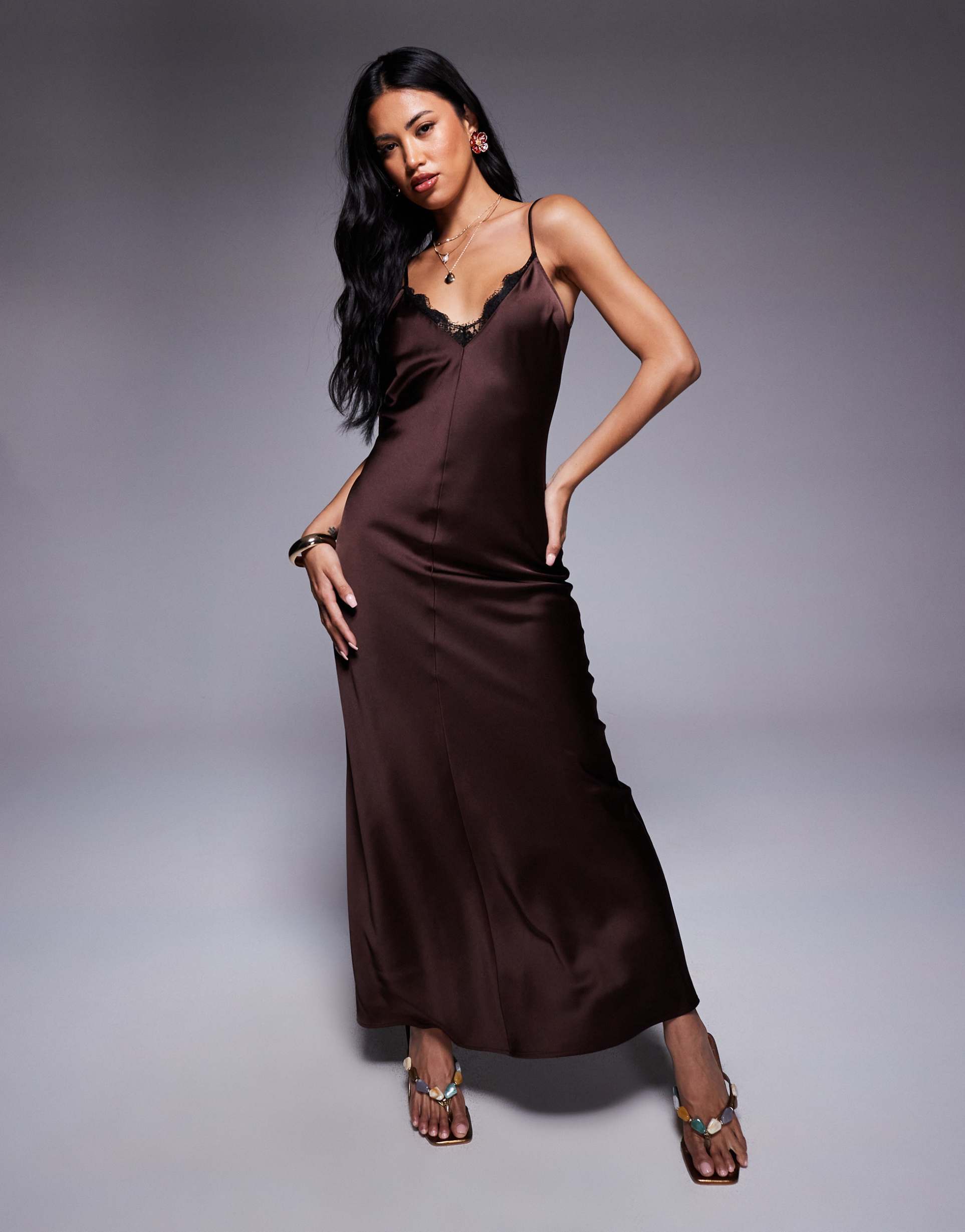 ASOS DESIGN V NECK LACE TRIM SATIN SLIP MAXI DRESS IN CHOCOLATE