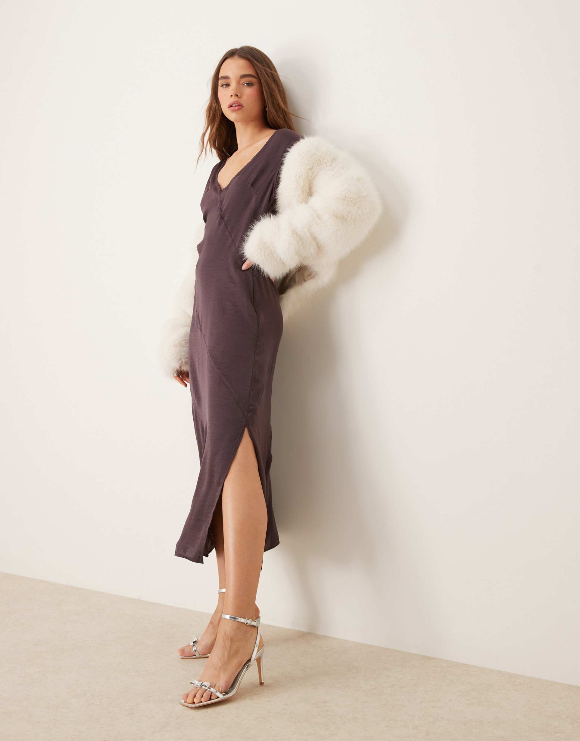 ASOS DESIGN V-NECK SATIN MIDI DRESS WITH RAW SEAMING IN MAUVE