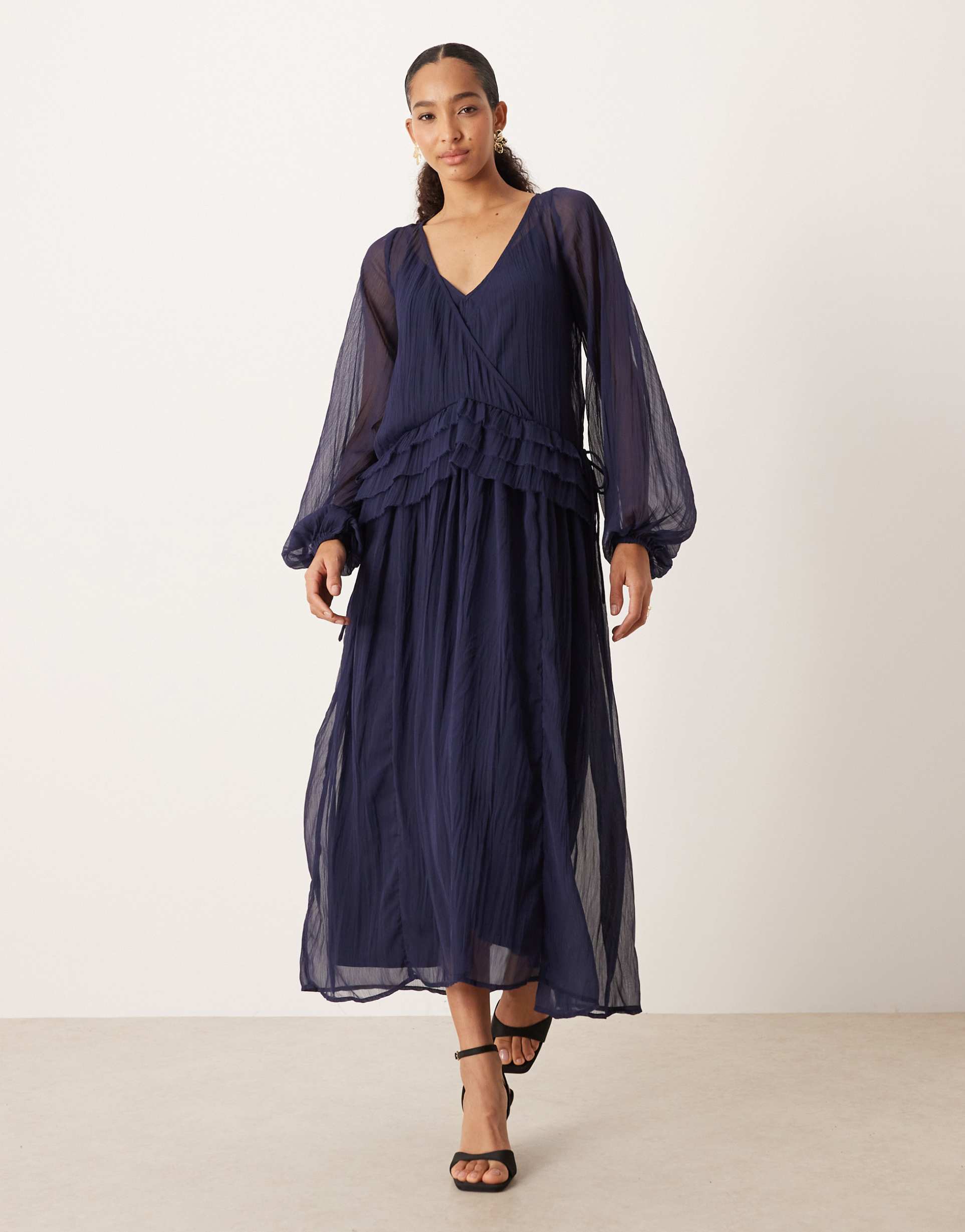 Soft chiffon fabric and a relaxed regular fit define this elegant smock dress in a deep matte navy hue. The midi length flows gracefully, complemented by romantic ruffle trims that adorn the bodice and skirt, while blouson long sleeves add a sophisticated volume. A flattering V-neckline enhances the neckline silhouette, perfect for spring, summer, or autumn occasions. This versatile dress suits cocktail parties, brunches, and date nights, blending classic style with a modern touch for effortless charm and comfort.