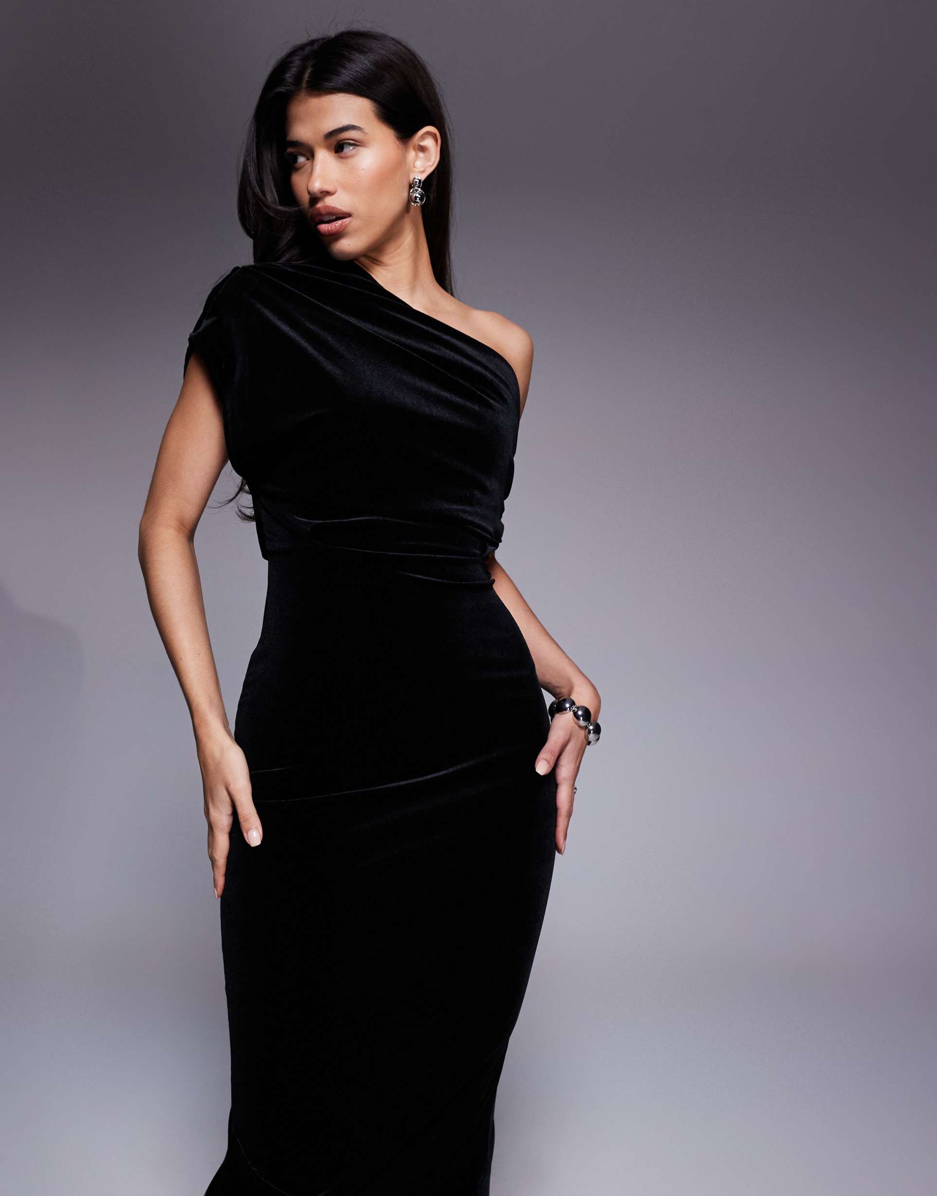ASOS DESIGN VELVET DRAMATIC NECKLINE MIDI DRESS WITH SLIT IN BLACK