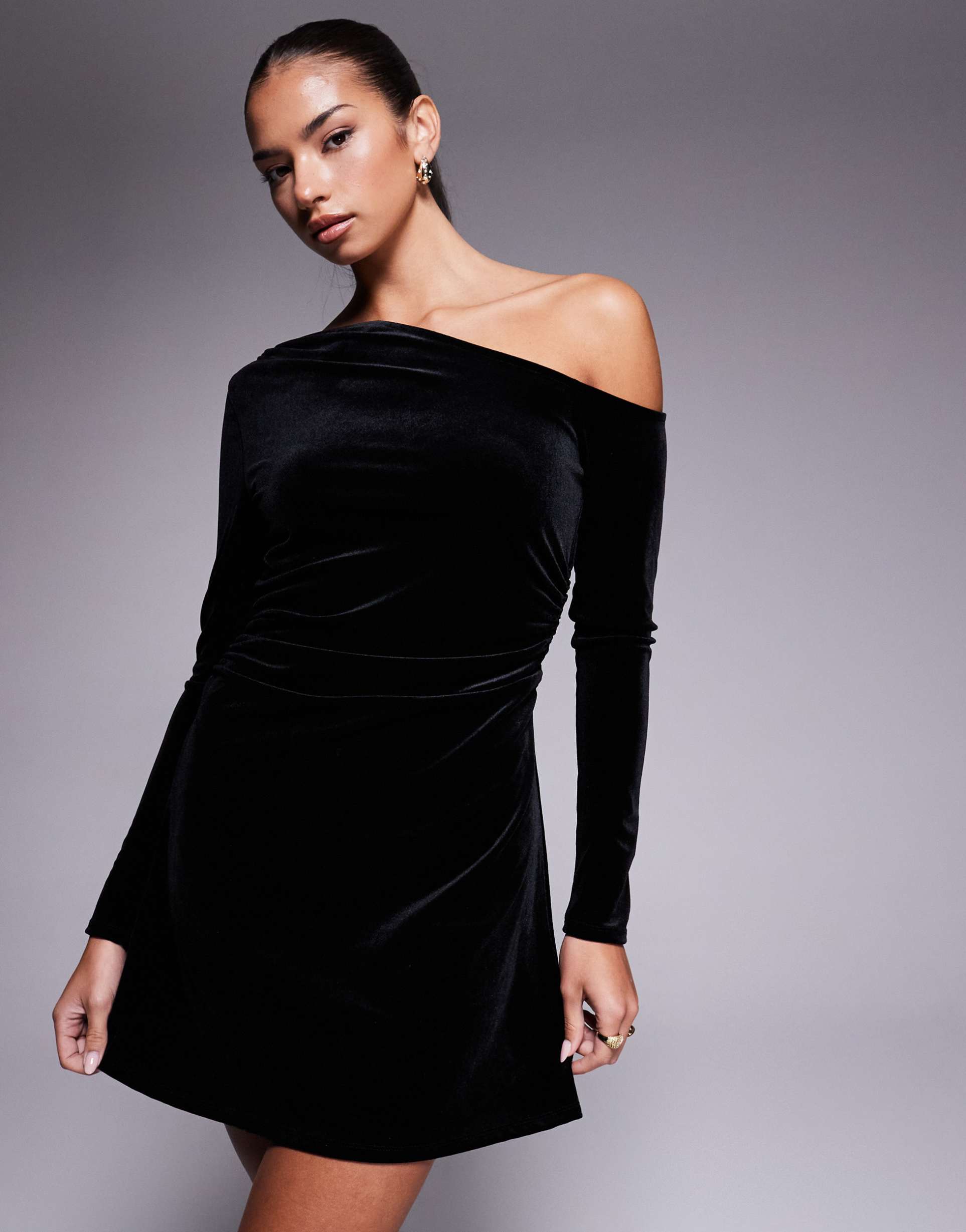 ASOS DESIGN VELVET FALLEN SHOULDER MINI DRESS IN BLACK