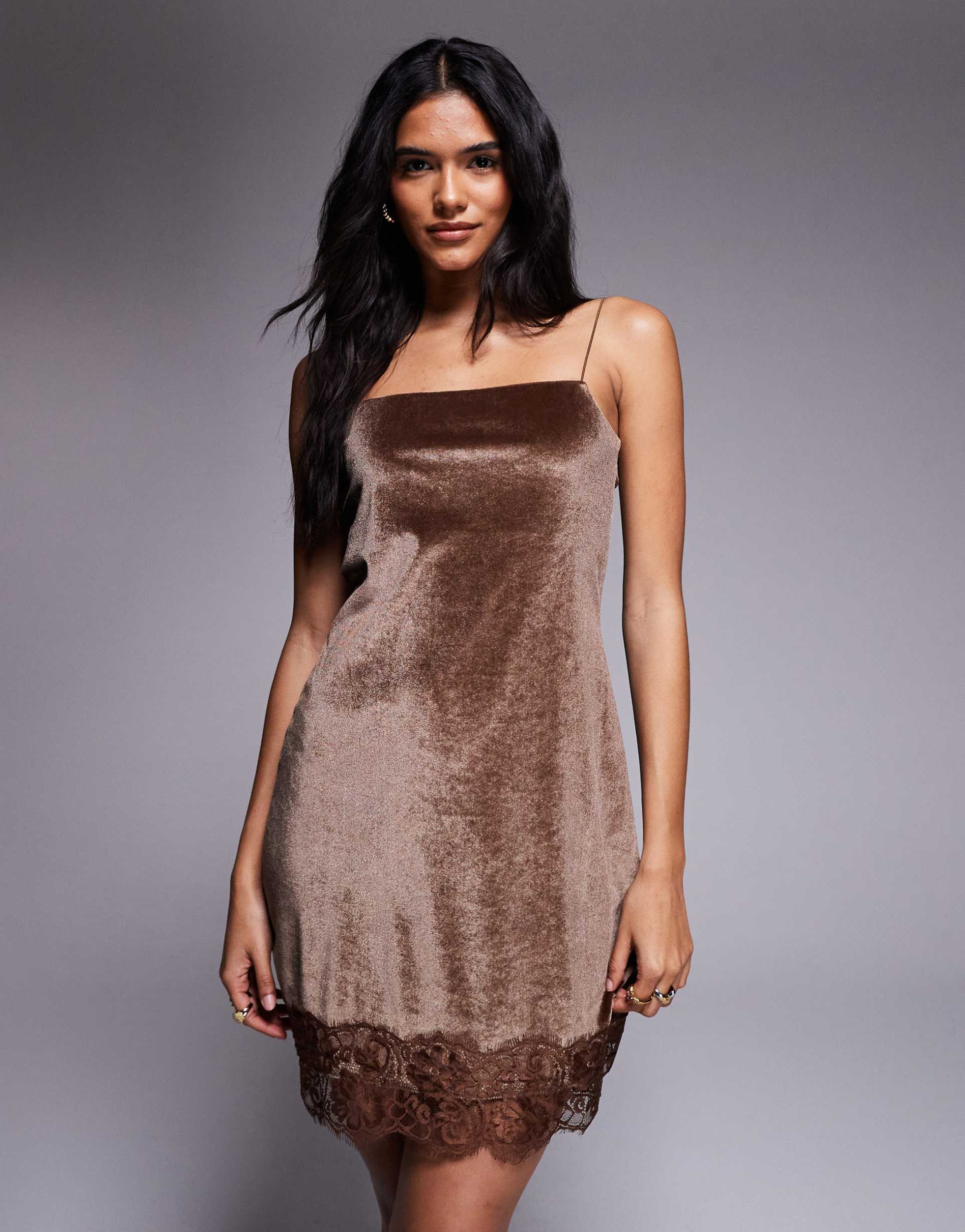 ASOS DESIGN VELVET MINI DRESS WITH DEEP LACE HEM TRIM IN CHOCOLATE