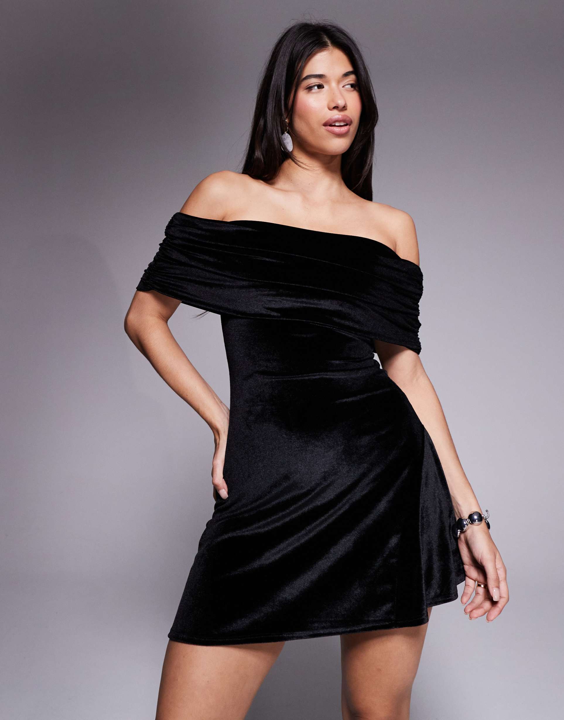 ASOS DESIGN VELVET OFF SHOULDER SKATER MINI DRESS IN BLACK