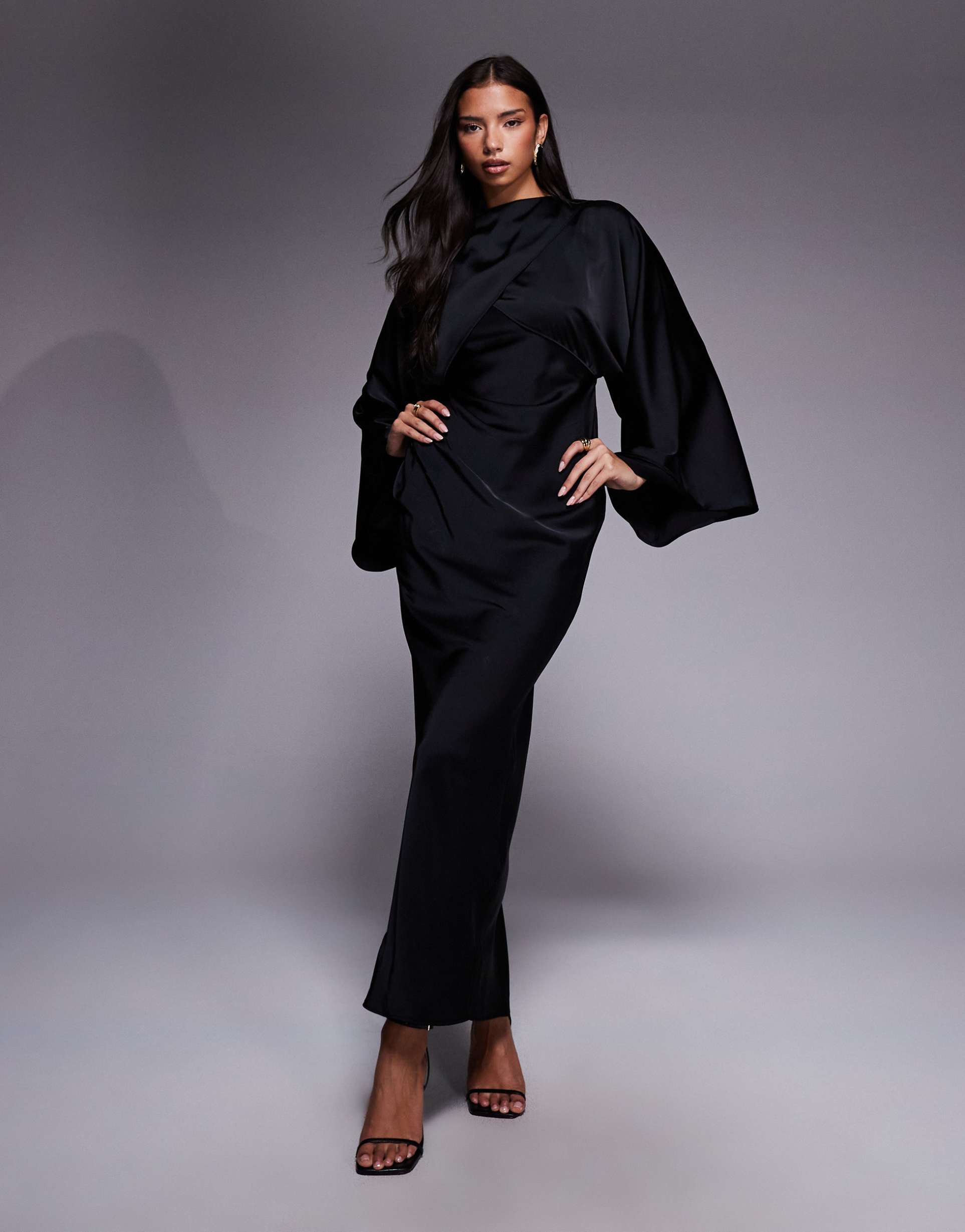 ASOS DESIGN WRAP FRONT BATWING SATIN BIAS CUT MAXI DRESS IN BLACK