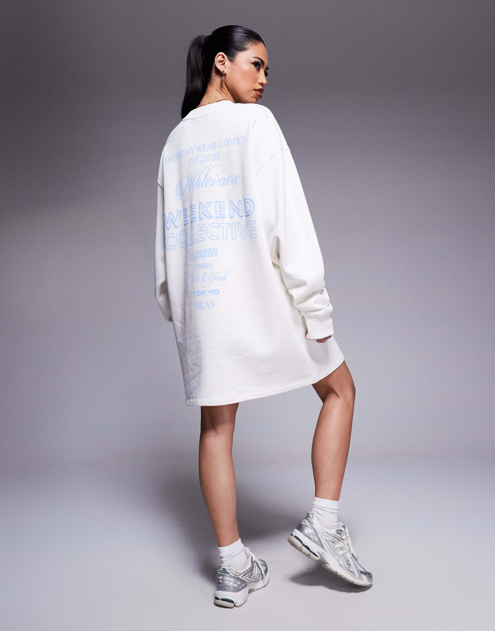 WEEKEND COLLECTIVE SWEATSHIRT DRESS WITH SCRIPT GRAPHIC IN CREAM