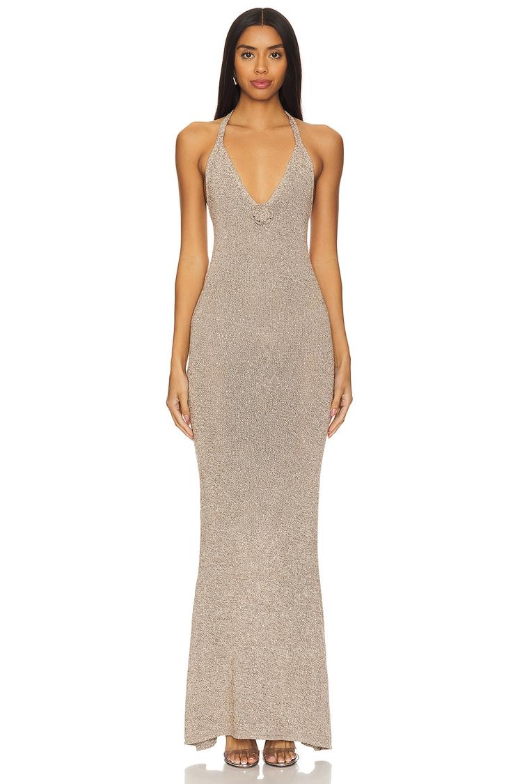 Shimmering beige sequins and a figure-hugging column silhouette define this maxi dress with a plunging V-neckline and halterneck tie closure. The open back with tie detail and sleeveless styling create an alluring, elegant look perfect for cocktail parties, date nights, or sophisticated evening events. Crafted from a blend of polyester, cotton, and viscose, this dress offers subtle texture and gentle stretch for comfort and style. Clean hemlines and a 3D tonal rosette at the neckline add refined embellishment to this standout piece.
