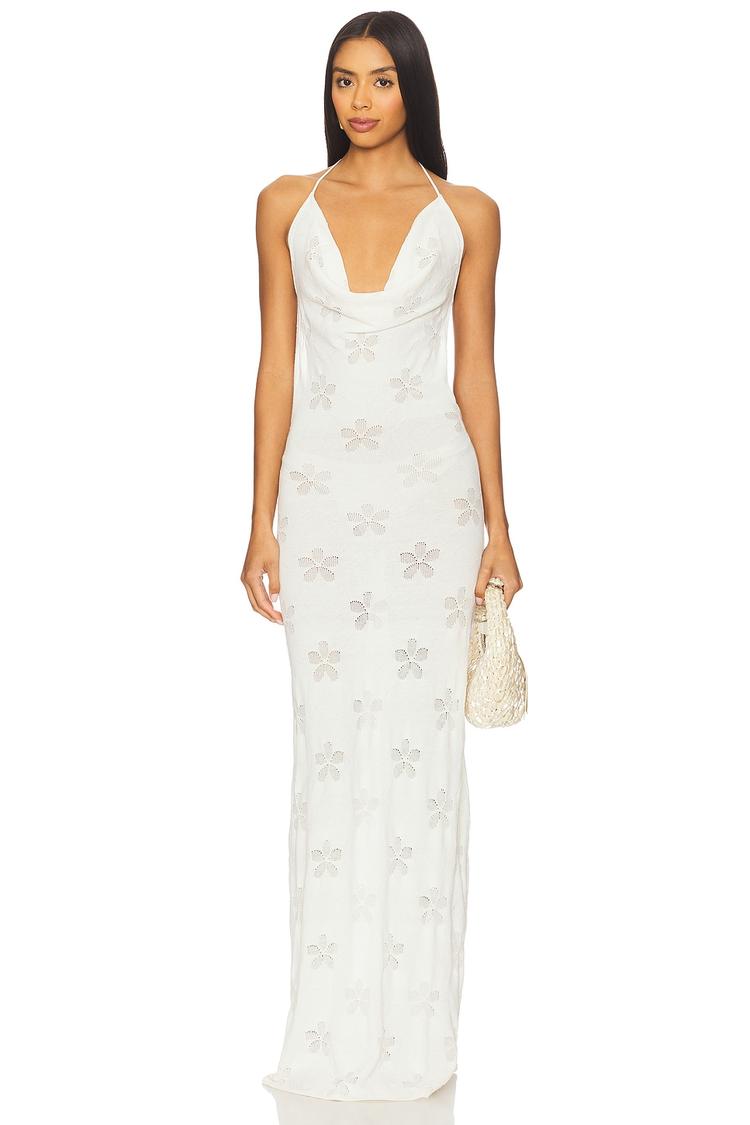 Soft cotton-nylon knit fabric with a semi-sheer finish elevates this slip dress featuring an elegant draped neckline and delicate all-over embroidered floral patterns. The maxi length and slim fit create a graceful silhouette, complemented by a halterneck and tie-back closure that adds a modern touch. Perfect for spring and summer occasions like brunch, date nights, or cocktail events, this minimalist yet sophisticated dress blends comfort and style effortlessly.