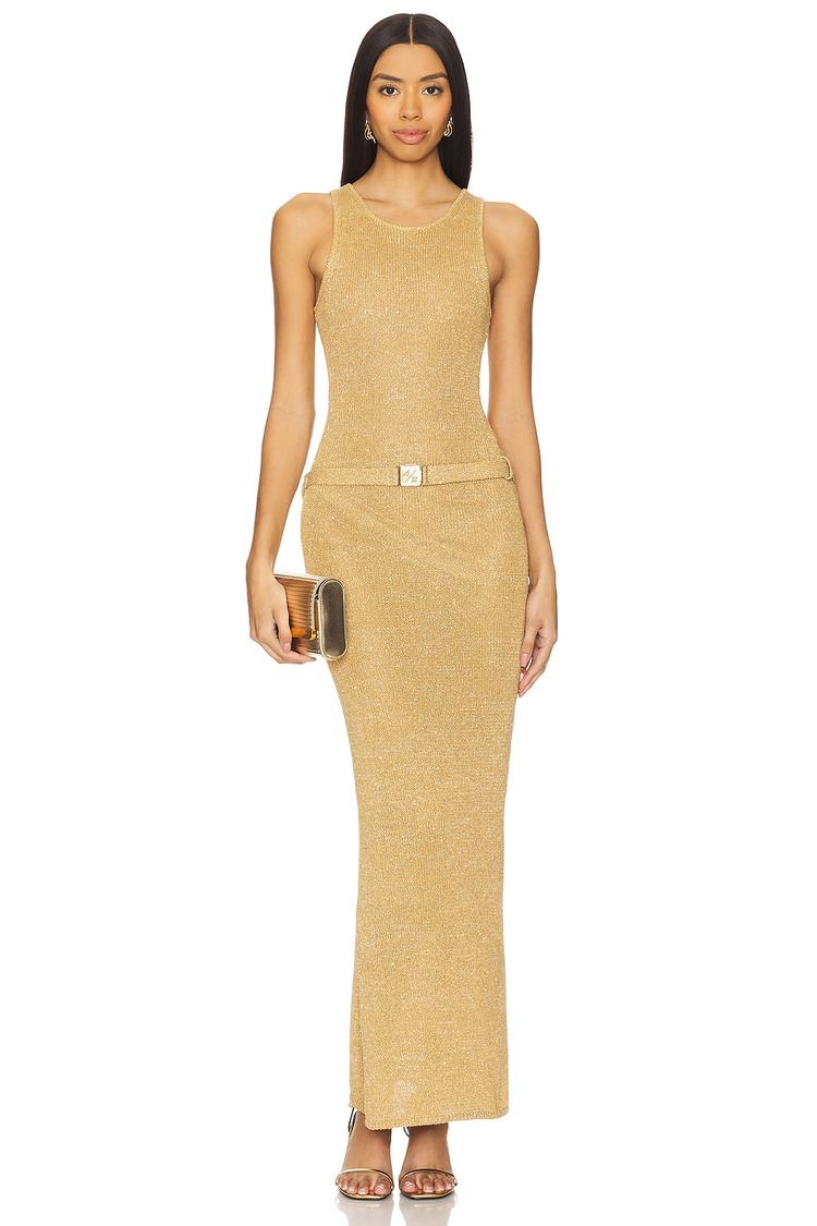 Metallic threading adds a subtle shimmer to this fitted column dress, featuring a high neckline and sleeveless wide straps for a sleek silhouette. The maxi length and clean hemline elongate the figure, while the optional gold belt at the waist enhances the sophisticated look. Crafted from a midweight slinky knit blend of polyester, cotton, rayon, and elastane, this versatile dress suits cocktail parties, date nights, and elegant evening events with ease.