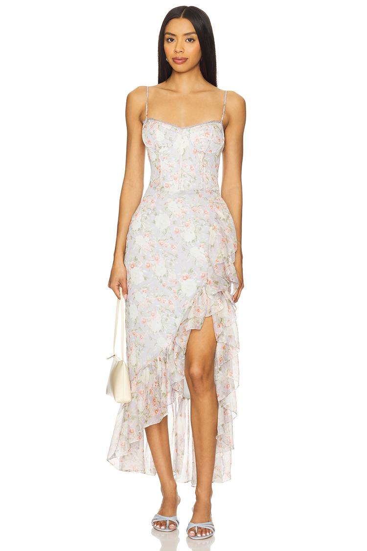 Soft chiffon fabric and a figure-hugging silhouette combine to create the Brisbane Dress, featuring a boned bodice and delicate lace trim along the sweetheart neckline. Adjustable spaghetti straps complement the sleeveless design, while a ruffled asymmetric hem adds romantic movement. Its midi length and fitted cut make it ideal for spring and summer occasions such as date nights, cocktail parties, or semi-formal events. The subtle floral print in dusty pinks, blues, and greens enhances its elegant and sophisticated vibe.