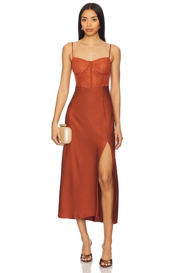 A sleek rust-colored corset dress crafted from midweight satin fabric offers a fitted silhouette that highlights your figure. Featuring a sweetheart neckline with delicate lace trim on the bustier bodice and adjustable spaghetti straps, this midi dress exudes modern elegance. The hidden back zipper ensures a smooth finish, while the thigh-high slit adds a daring touch. Ideal for date nights, cocktail parties, or sophisticated night outs, its versatile style suits all seasons. Elevate your evening wardrobe with this refined and sexy satin dress.