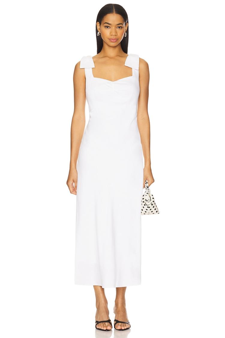 Soft, midweight linen and viscose blend fabric lends a refined feel to this elegant column dress, perfect for spring and summer occasions. Featuring a flattering fitted silhouette with a chic square neckline and sleeveless wide straps, it highlights bow accents at the shoulders and subtle front ruching for delicate detailing. The midi length and clean hemline create a timeless look ideal for brunches, cocktail parties, or date nights. A hidden side zipper ensures a sleek finish, making it a sophisticated choice for versatile stylish moments.