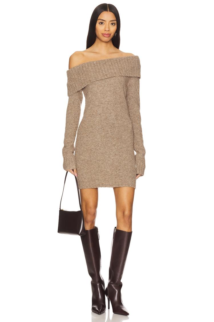 A cozy off-shoulder sweater dress crafted from a soft, midweight knit blend of polyester, nylon, wool, and elastane. The fitted silhouette and mini length create a flattering profile, complemented by long sleeves and a ribbed neckline trim that adds subtle texture. This versatile piece is ideal for autumn and winter days, perfect for casual outings, brunches, or date nights. Its slip-on style ensures effortless wear, making it a chic and comfortable choice for everyday elegance.