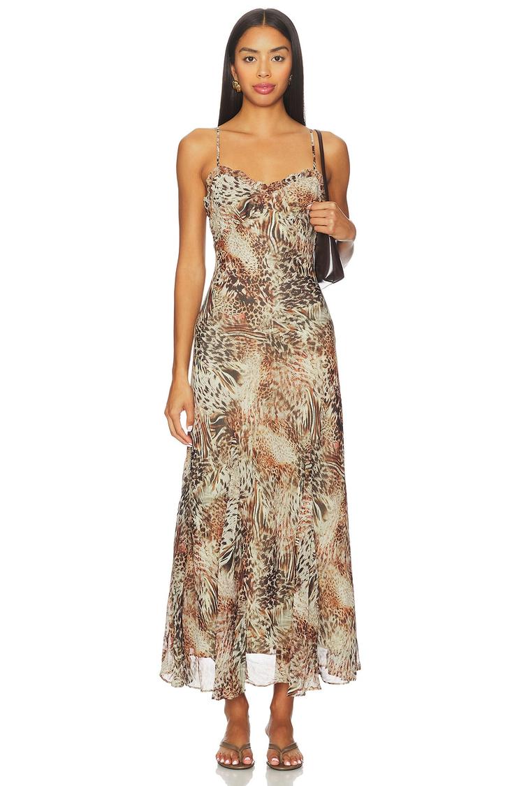 Heavyweight chiffon brings a luxurious feel to this slim-fitting slip dress featuring an all-over animal print in warm brown, beige, and black hues. The midi length and sweetheart neckline with ruffle detailing create an elegant silhouette, balanced by adjustable spaghetti straps for a perfect fit. A hidden back zipper ensures a seamless look. Ideal for spring and summer evenings, this versatile dress suits date nights, cocktail parties, and night outs with effortless grace.