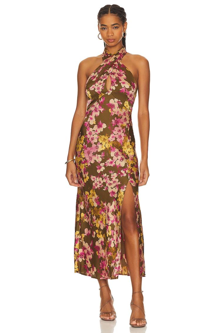 Soft satin fabric with a floral print creates a sophisticated slip dress featuring a halter neckline and a keyhole back with button closure. The fitted silhouette is enhanced by a boned bodice and a front slit that adds a touch of allure to the midi-length hem. Perfect for spring and summer evenings, this elegant dress suits cocktail parties, date nights, and night outs with ease, offering a seamless blend of comfort and style.