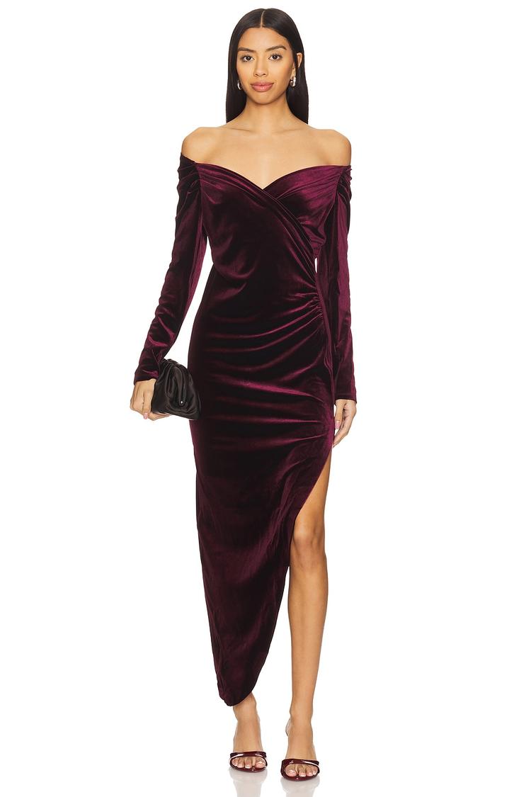Luxurious matte burgundy velvet with a figure-hugging column silhouette defines this off-shoulder dress. The long sleeves and fitted cut emphasize elegance, while the asymmetrical hem and side slit add a sexy, sophisticated edge. Crafted from a blend of polyester, velvet, and elastane, it offers midweight comfort and stretch for a flattering fit. Ideal for autumn and winter cocktail parties, date nights, or glamorous evening outings, this dress pairs timeless style with modern allure for standout wear at any special occasion.