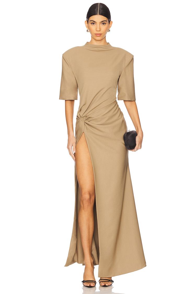 Soft heavyweight crepe fabric and a sleek column silhouette define this elegant maxi dress with a high neckline and elbow-length sleeves. The fitted shape is enhanced by a draped front knot detail and a daring side slit, creating a sophisticated look perfect for cocktail events, formal dinners, or date nights. Padded shoulders add structured refinement, while the hidden back zipper ensures a smooth fit. Its matte beige tone offers timeless versatility for all-weather wear, effortlessly balancing modern style with graceful poise.