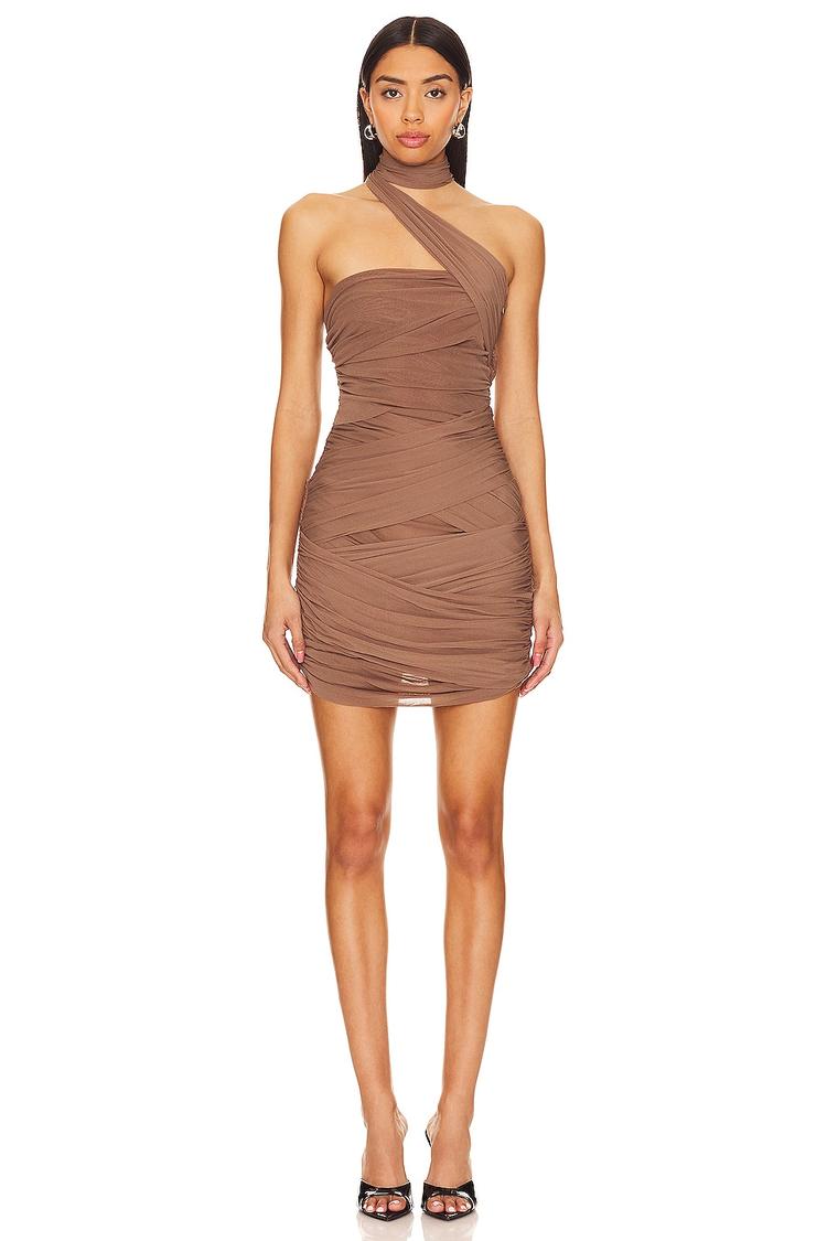 Draped jersey fabric sculpts a figure-hugging sheath silhouette in this matte brown mini dress. Featuring a halter neck with hidden side zipper and button closure, it offers a sultry strapless look paired with a clean hemline. The semi-sheer nylon and jersey blend adds a delicate, modern texture perfect for date nights, cocktail parties, or night outs. Fully lined for comfort, this sexy and modern mini dress delivers effortless allure and versatility across seasons.