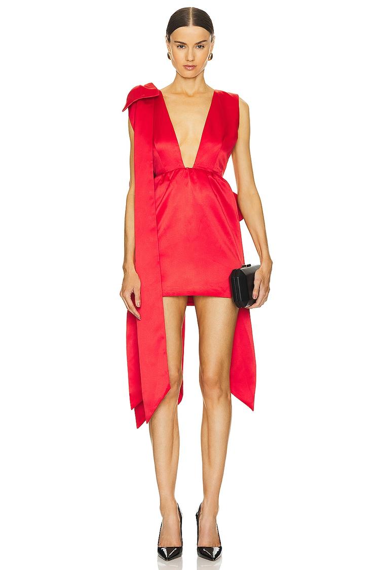 A bold matte red shift dress with a striking plunging neckline and mini length perfect for turning heads. The sleeveless design with wide straps and an open back creates a sleek, fitted silhouette accentuated by elegant bows on the shoulder and back. Crafted in smooth polyester with a concealed zipper for a seamless finish, this dress suits cocktail parties, date nights, and nights out with friends. Its clean hemline and modern, sexy style make it a standout choice for confident, contemporary dressing across all seasons.