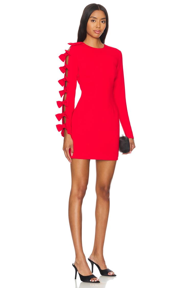 A sleek mini shift silhouette in vibrant matte red crepe fabric offers a fitted, flattering look perfect for cocktail nights and date evenings. The dress features long regular sleeves accentuated with bow-tied cut-out details cascading along one arm and a keyhole back that adds subtle allure. With a clean hemline and concealed back and side zippers, this elegant and sophisticated piece blends timeless style with modern accents, making it ideal for sophisticated night outs and special occasions.