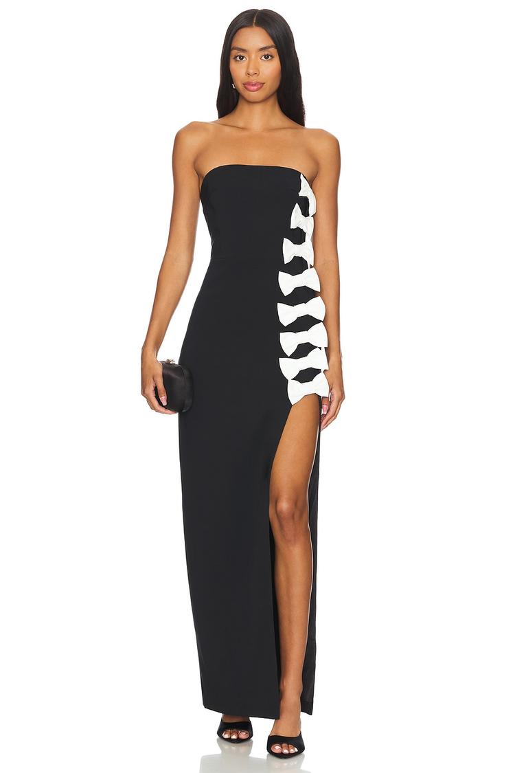A sleek silhouette and a dramatic thigh-high slit define this elegant column maxi dress, crafted in matte black crepe fabric with a hint of stretch from spandex. The strapless, boned bodice ensures a fitted, sophisticated shape, enhanced by a striking line of white bows cascading down the side. Finished with a hidden back zipper closure and a clean hemline, this dress is perfect for cocktail parties, date nights, or upscale evening events where timeless style meets modern allure.