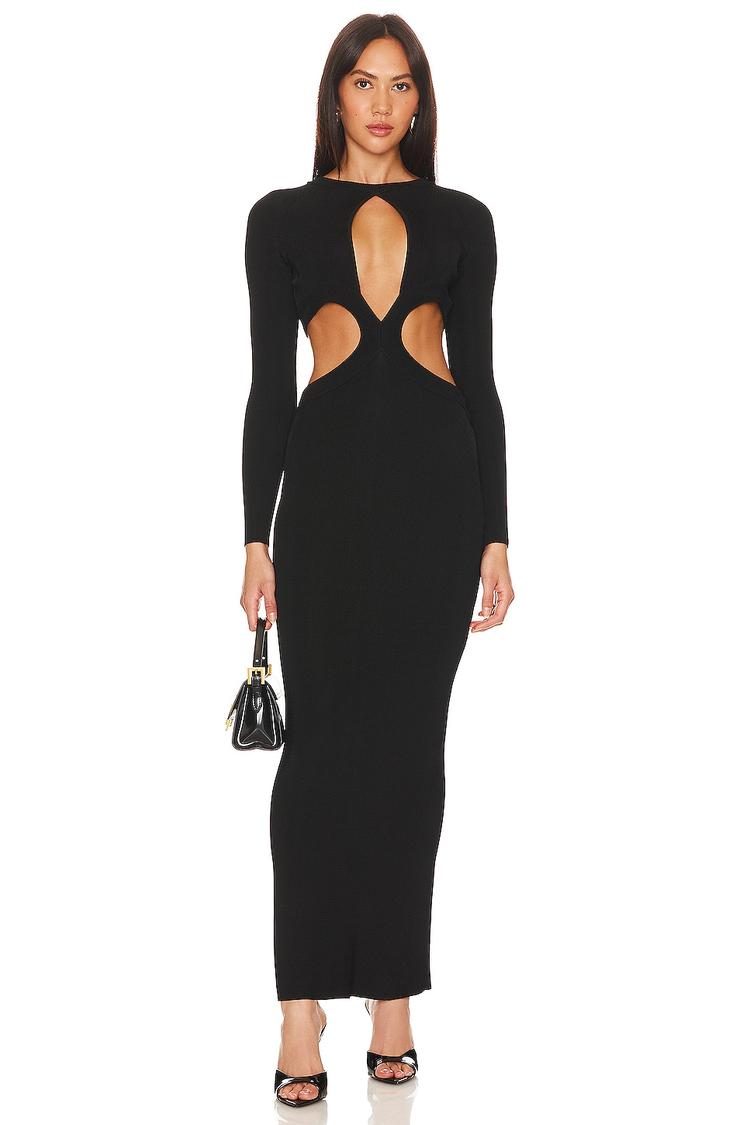 Cut-outs and a sleek keyhole neckline define this matte black sheath dress crafted from ribbed viscose jersey fabric. The fitted maxi silhouette with long sleeves and a back slit offers a sexy yet modern look, perfect for date nights, cocktail events, or a stylish night out. Button loop closures at the back add a subtle detail, while the side slit enhances movement and allure. This versatile all-weather piece balances bold design with comfortable stretch, making it a standout choice for sophisticated evening occasions.