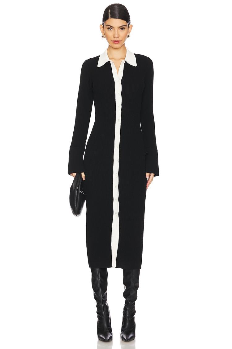 A sleek black midi shirt dress features a striking white button placket and classic polo collar, creating an elegant color-blocked effect. Crafted from slinky viscose and polyester knit, its slim fit and long cuffed sleeves offer refined sophistication perfect for autumn and winter. The clean hemline and front button closure add timeless polish, making this dress ideal for workwear, business casual events, or date nights where understated style is key.