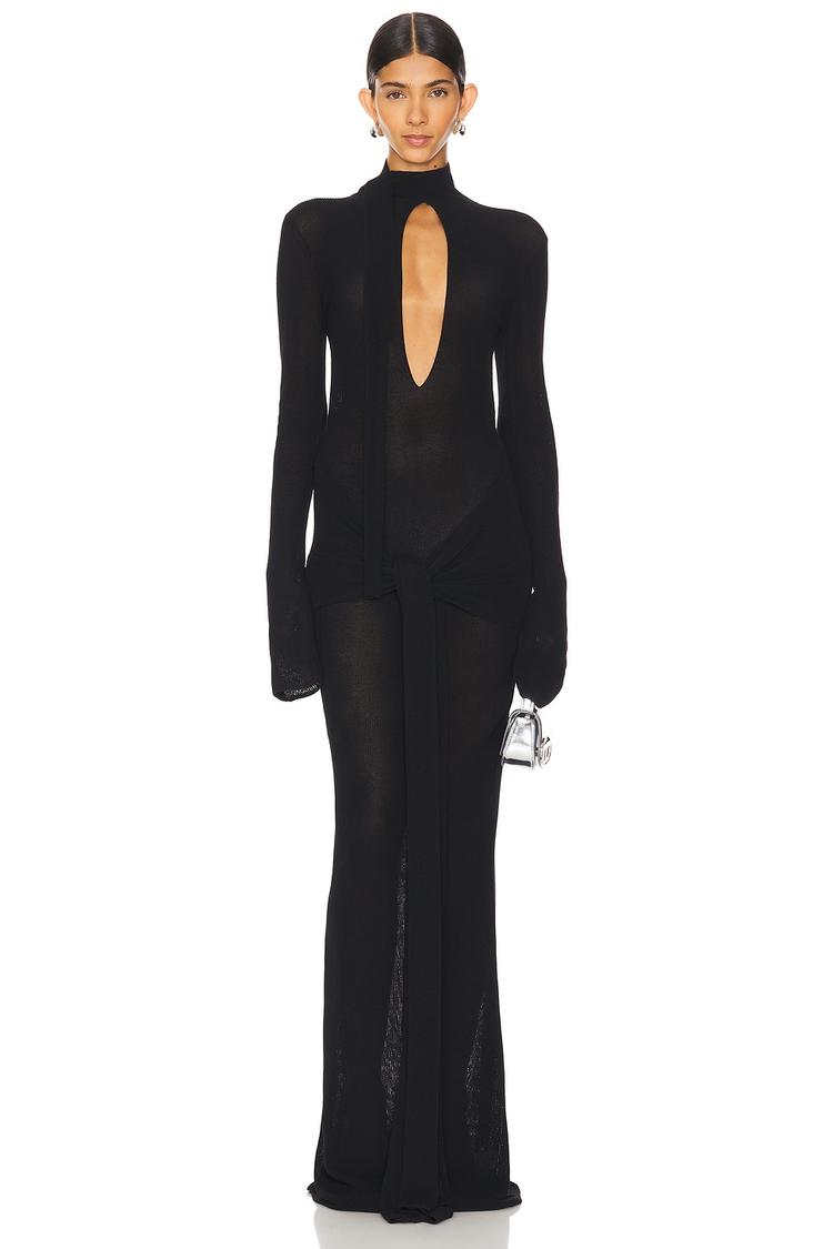 Sleek and sultry, this matte black column dress features a dramatic front keyhole neckline paired with long sleeves for a balanced silhouette. Crafted from a semi-sheer cotton-polyamide knit, it offers a figure-hugging slim fit that gracefully extends to a maxi length with a clean hemline. The subtle front ribbon tie adds an elegant detail while the covered back keeps the look refined. Ideal for cocktail evenings, date nights, and stylish night outs, this modern minimalist piece blends sensuality with effortless sophistication.