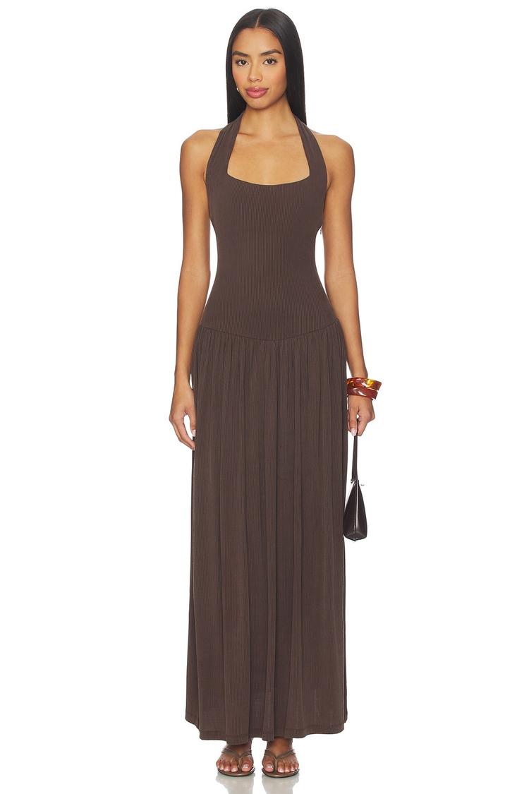 Soft ribbed cotton fabric sculpts a slim silhouette in this halterneck slip dress, flowing effortlessly to a clean maxi hem. The hidden side zipper ensures a smooth fit, while the strapless back adds a minimalist yet chic touch. Ideal for spring and summer, this versatile dress suits casual outings, brunch dates, and vacation days with ease, combining comfort and style in a warm matte brown hue.