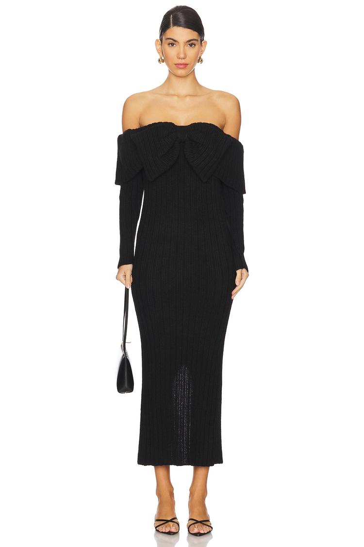 Soft knit fabric blends alpaca, cotton, and viscose for cozy warmth and refined texture in this elegant sheath dress. The off-shoulder foldover neckline with a bow detail and long sleeves create a sophisticated silhouette, while a back vent slit adds subtle allure and ease of movement. Falling to a midi length, this fitted dress is perfect for autumn and winter evenings, making it ideal for cocktail parties, formal events, or night outs. Slip-on styling completes the minimalist, chic look with a timeless black hue.