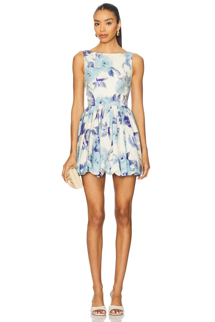 Soft polyester poplin fabric forms a breezy mini dress with a flared A-line silhouette and a ruched, ruffled skirt hem for a playful touch. The sleeveless design with wide straps and a round neckline keeps the look fresh and classic. Hidden side seam zipper closure ensures a smooth fit. Printed with a delicate floral pattern in blue and purple hues on a crisp white base, this dress is ideal for spring and summer occasions like casual outings, brunch dates, or a relaxed date night.
