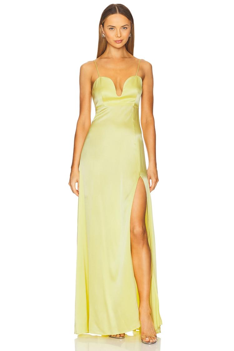 Soft charmeuse silk with a matte light yellow hue creates a stunning figure-skimming slip dress featuring a dramatic plunge neckline with wired support and adjustable shoulder straps. The fitted silhouette flows into a clean maxi hem with a daring side slit, perfect for formal occasions, cocktail parties, and elegant date nights. Lightweight and breathable, this gown embodies classic sophistication and effortless glamour for spring and summer events.