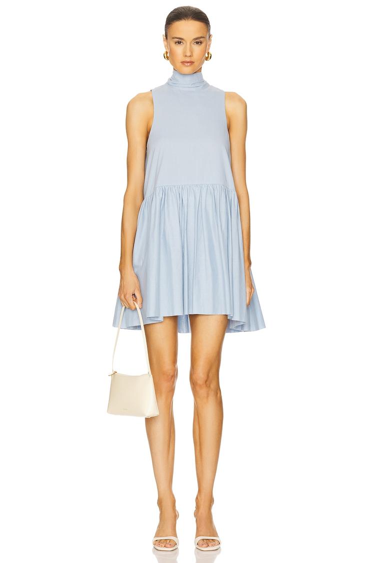 Soft, lightweight cotton poplin shapes a breezy babydoll mini dress in a matte light blue hue. The sleeveless silhouette features a high neckline with a charming halterneck tie-back bow that adds a playful, feminine touch. A ruffled hem enhances the loose, comfortable fit, making it ideal for warm spring and summer days. This versatile piece transitions effortlessly from casual brunches to relaxed date nights, offering classic style and easy pull-on wear with a touch of cute sophistication.