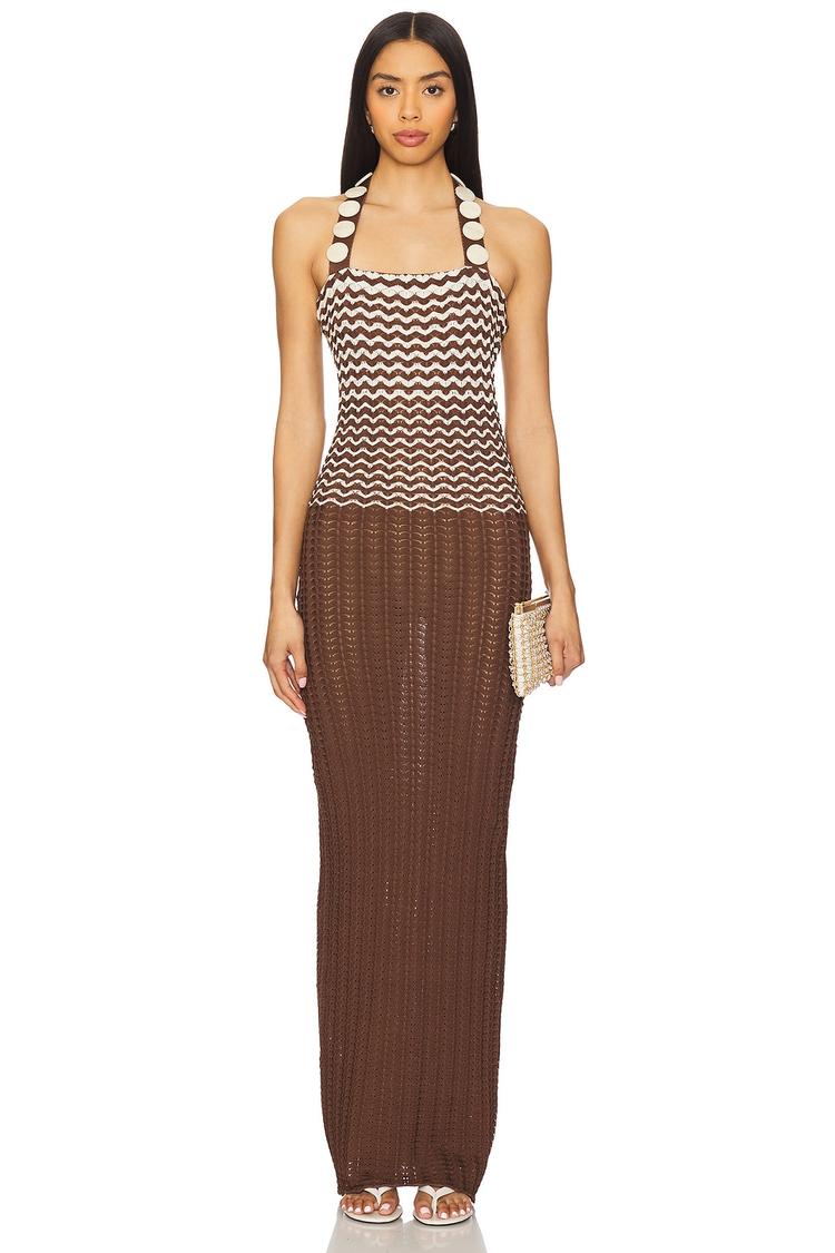 Sunlit days and relaxed evenings come alive in this bohemian-inspired slip dress featuring a flattering slim fit and halter neckline with delicate stone accents on the straps. Crafted from a midweight, semi-sheer open knit nylon fabric, the maxi length and chevron pattern in warm brown and beige tones create effortless summer elegance. The clean hemline and pull-on slip-on styling enhance comfort and ease, making it ideal for casual outings, beach vacations, or brunch dates. Versatile and stylish, this dress blends breezy texture with subtle shimmer for a standout look.