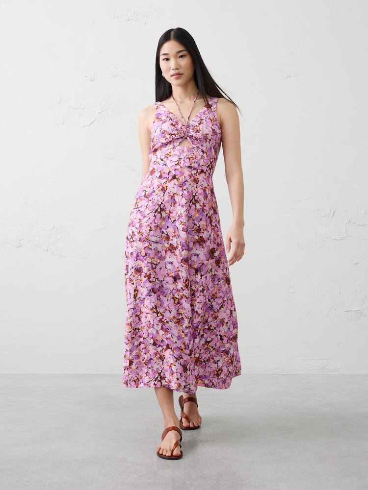 LINEN-BLEND CUTOUT TIE-FRONT MIDI DRESS