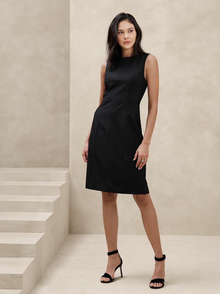 A classic matte black sheath dress tailored with a fitted silhouette and knee-length hem perfect for professional and elegant occasions. The sleeveless design and round neckline offer a clean and sophisticated look, while subtle front draping adds a sculpted detail enhancing the figure. Crafted from smooth polyester fabric, this dress transitions seamlessly from business casual meetings to cocktail events and refined workwear settings. Its covered back with a discreet closure ensures a sleek finish, making it a versatile staple for year-round wear.