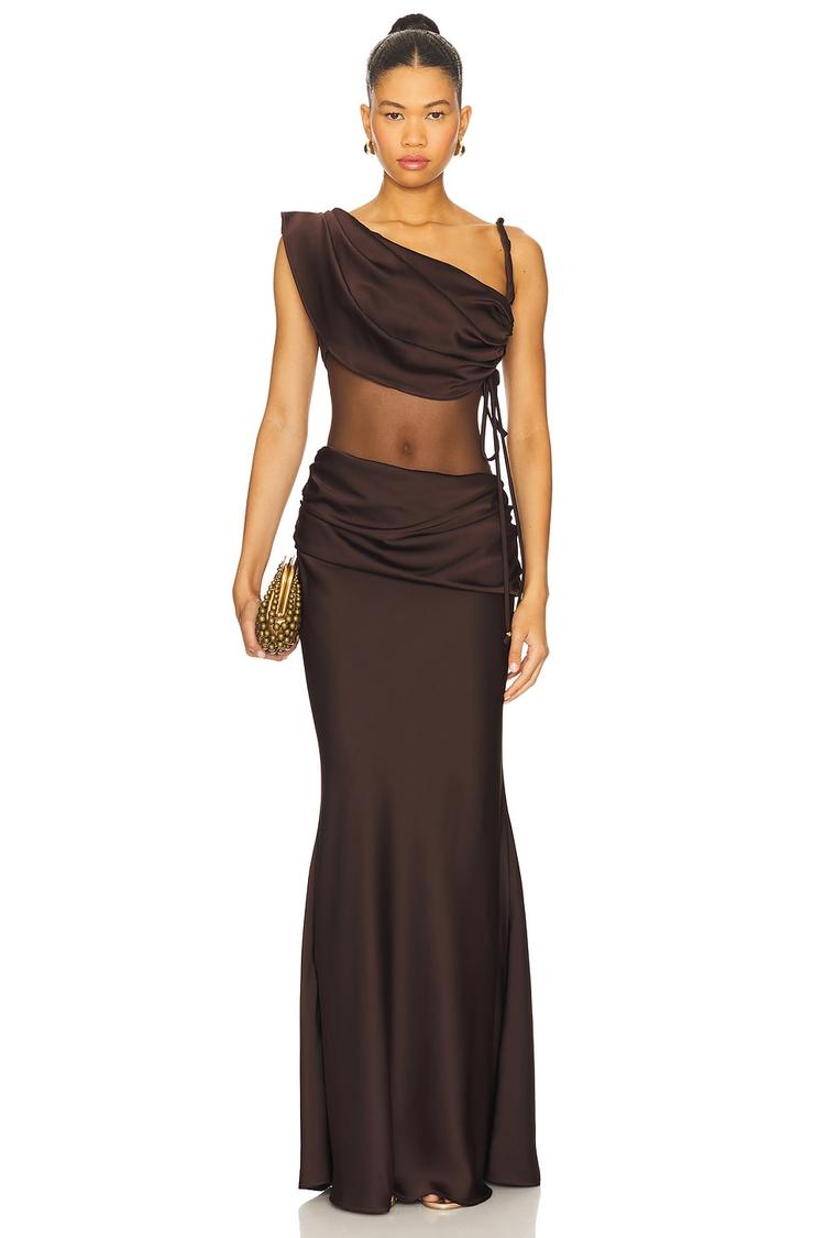 Sleek satin and mesh blend form a striking column silhouette with an asymmetric neckline and sleeveless wide straps. The maxi length gracefully elongates the figure while side ruching with a tie-up closure adds a modern touch and subtle texture. Sheer mesh panels at the bodice create a sexy yet sophisticated effect, perfect for cocktail parties, night outs, or romantic date nights. This pull-on dress combines elegance and contemporary design for versatile evening wear that commands attention.