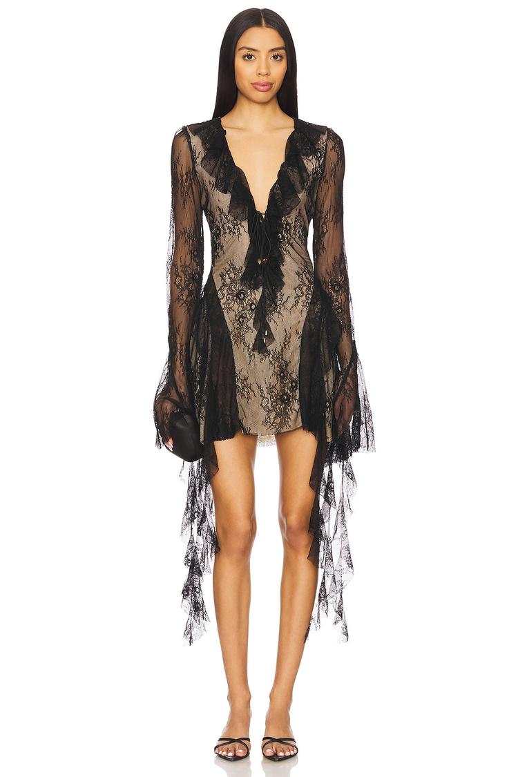 Delicate black lace shapes a slim mini shift dress featuring a plunging V-neckline and long flounce sleeves with raw edges that cascade dramatically. Ruffled trims and draped accents add depth and elegance to the semi-sheer fabric, perfect for confident night outs, cocktail events, or intimate date nights. The pull-on style with a lace-up front offers an alluring fit that balances modernity and sexy sophistication. This dress embodies a flawless blend of intricate design and versatile style for standout evening occasions.