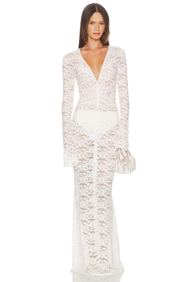 Delicate sheer white lace forms a sleek column silhouette in this maxi dress, featuring a deep V-neckline and long sleeves for a modern, elegant allure. Crafted from a stretchy nylon and spandex blend, it offers a slim fit that skims the body gracefully. The pull-on style ensures easy wear, while the covered back adds subtle sophistication. Ideal for cocktail evenings, date nights, or night outs, this dress melds sensuality with refined simplicity, perfect for spring through autumn events.