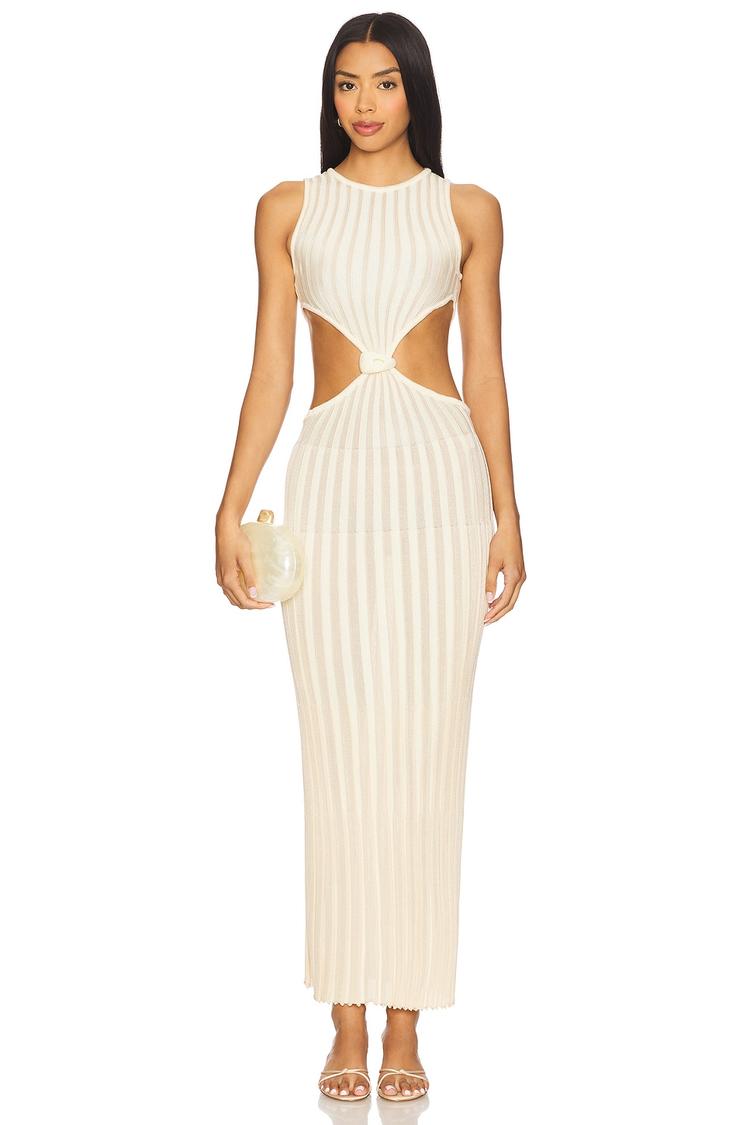 Heavyweight ribbed knit fabric sculpts a bodycon sheath silhouette in this Off-White maxi dress featuring high neck and wide straps for a modern edge. The standout wrap-around cut-outs at the waist add a bold, sexy detail that elevates this slip-on dress. Its sleeveless design and clean hemline offer sleek sophistication, making it ideal for date nights, cocktail events, and night outs. Crafted from a nylon and acrylic blend, it balances comfort with structure and style for versatile all-weather wear.