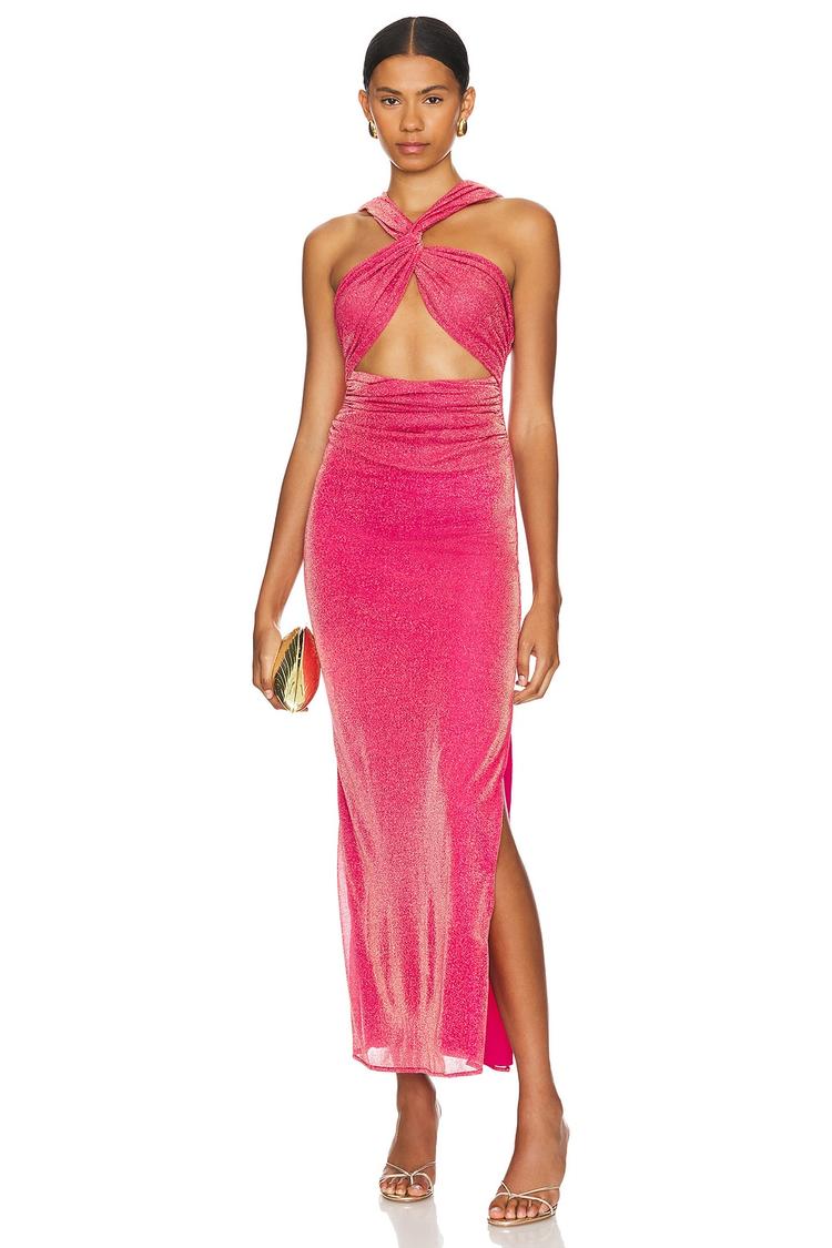 A shimmering bright pink column silhouette defines this maxi dress, crafted in a slinky knit fabric with metallic threading for a radiant effect. The twist neckline and sleeveless design enhance its sexy and sophisticated appeal, while the fitted cut flatters the figure. Featuring a side slit and pull-on styling, it combines comfort with allure. Perfect for spring and summer cocktail parties, date nights, or a night out, this dress offers effortless elegance in a fully lined, stretch blend of nylon, elastane, and polyester.
