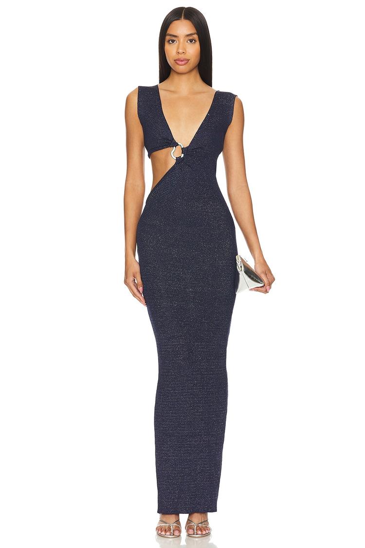 Metallic threading and sleek ring accents highlight a deep neckline and open back, creating a striking column silhouette in this navy maxi dress. The bodycon fit and wide straps emphasize a modern, sexy style perfect for cocktail parties, night outs, or date nights. Crafted from a luxurious blend of nylon, polyester, and polyamide, its jersey knit fabric offers subtle shimmer and comfortable pull-on wearability. The clean hemline and metallic details add an edgy touch, making this dress a versatile choice for elegant evening occasions.