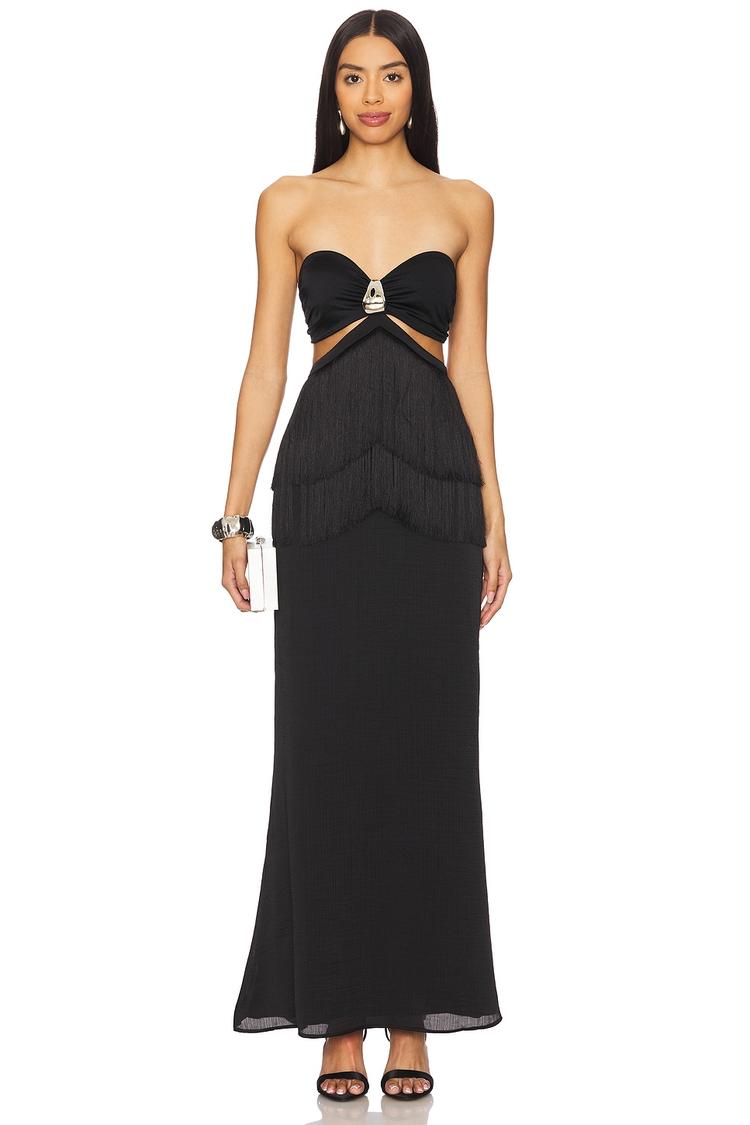 Heavyweight satin fabric and a sleek column silhouette define this stunning maxi dress. The strapless straight neckline highlights the shoulders, while boned sides ensure a fitted shape that flatters the figure. Intriguing silver-tone metal accents and fringe detailing on the front and back add dynamic texture and movement. The open back with a hidden side zip and back S-hook closure creates an elegant, sophisticated finish. Ideal for cocktail parties, date nights, or evening events, this dress blends glamour with modern refinement for all-weather wear.