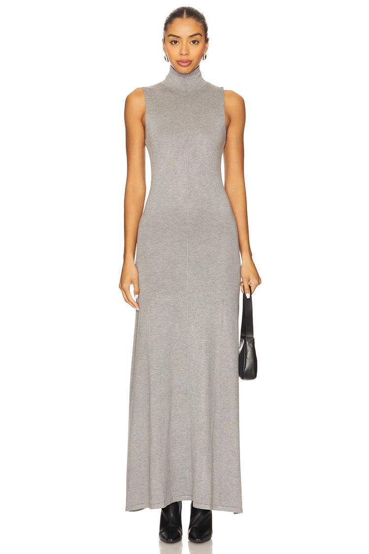 Soft knit fabric in a matte gray hue sculpts a sleek, column silhouette with a high neckline and sleeveless cut. This fitted maxi dress offers a minimalist style ideal for all-weather wear, featuring clean hemlines and effortless slip-on design. Perfectly suited for casual outings, brunch dates, or intimate evening gatherings, it blends timeless elegance with everyday comfort. The viscose-polyester blend ensures a smooth drape while maintaining breathable softness, making it a versatile piece for your wardrobe.