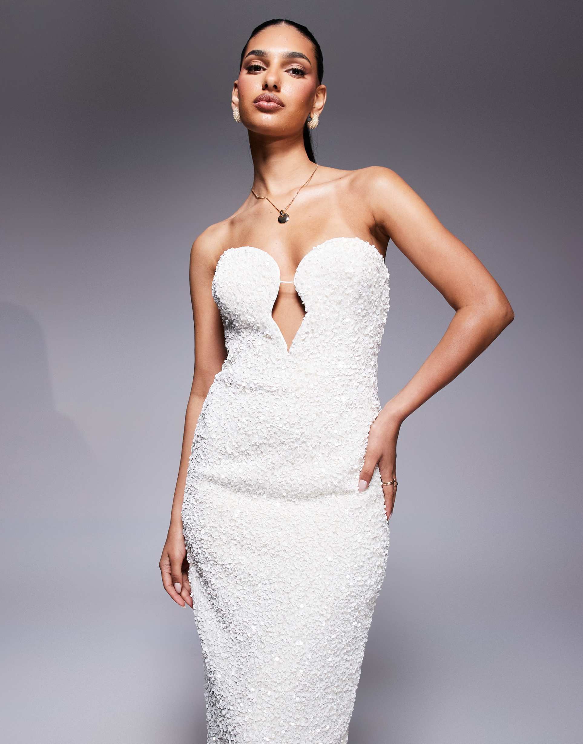 Sequined elegance shines through in this ivory sheath midi dress featuring a flattering sweetheart neckline and a daring cut-out front. The regular fit contours the body beautifully while the sleeveless design and back zip closure offer comfort and ease. Accented with a kick slit hemline, this dress is perfect for cocktail parties, date nights, and sophisticated evening events. Crafted from a blend of polyester and elastane, it provides a subtle stretch for an enhanced fit and graceful movement.