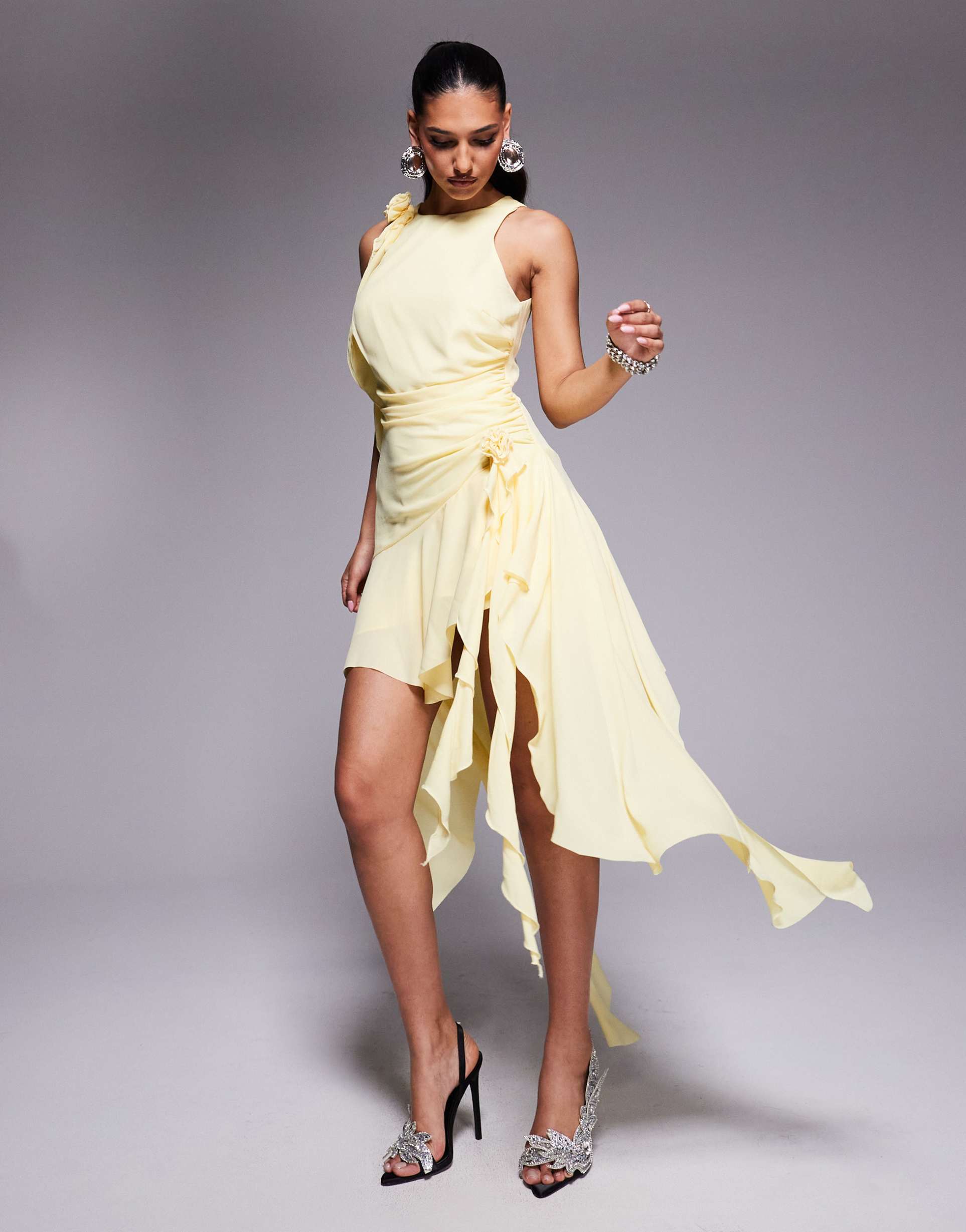 Soft matte yellow chiffon layered over polyester creates a romantic and elegant corset dress with an asymmetrical hemline that flows beautifully. The sleeveless, crew neck silhouette features ruched detailing and delicate ruffles draped on the front and hem, offering a regular fit that complements spring and summer occasions. Ideal for date nights, cocktail parties, and evening events, this lightweight sheer fabric dress blends comfort with standout style.