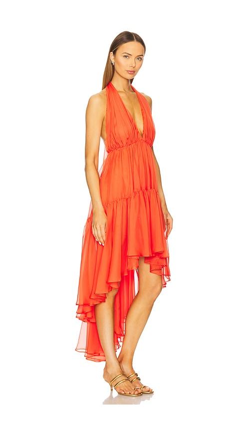BARDOT LEONA HIGH LOW RUFFLE DRESS IN ORANGE.