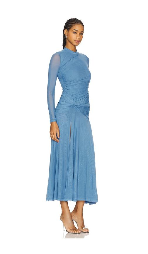 BARDOT LIYANA RUCHED MESH DRESS IN BLUE.
